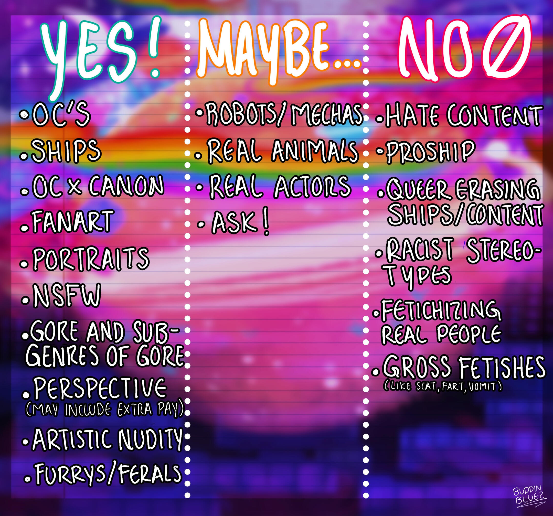 *PAYMENT: only paypal if you are outside of Mexico, otherwise, i also accept bank transfers.*Please check my commissions status in my bio in any of my social media before asking me for one.*Personal use only.*I PROBIHIT the use of AI and NFT on my drawings.*All established prices are kept in mind for only one character, for two characters they will be duplicated, for three triplicated etc etc.*If you commission me a very detailed character make it sure that it will cost more than the original price, but if you do not want to get a higher cost then I’ll simplify the design*Prices of backrounds will depend on how hard i find them to draw.*I won´t start with the drawing before getting the payment.*If you need the drawing by a specific date let me know! (not less than 1 week please).*I have the right to reject an order if i don´t feel comfortable with it.*Deliver of the drawing can be from 1 to 3 weeks, or even more if it is a very complex piece. I will be showing progress in the sketch and coloring so you can approve it or ask for changes.*No refunds once i start with the drawing.